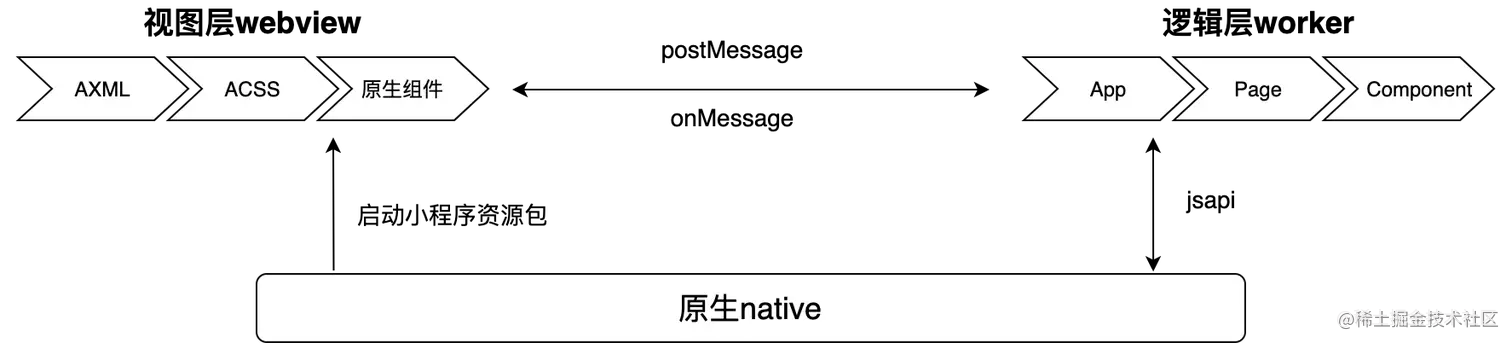 由于web开发太开放了,可以直接操作DOM,跳转到其他web页面,为了安全与管控(包括请求必须是https协议且域名必须设置白名单,逻辑层js代码不能访问浏览器DOM与BOM对象),小程序采用了双线程模型,即:视图线程(webview) 与 逻辑线程(worker)