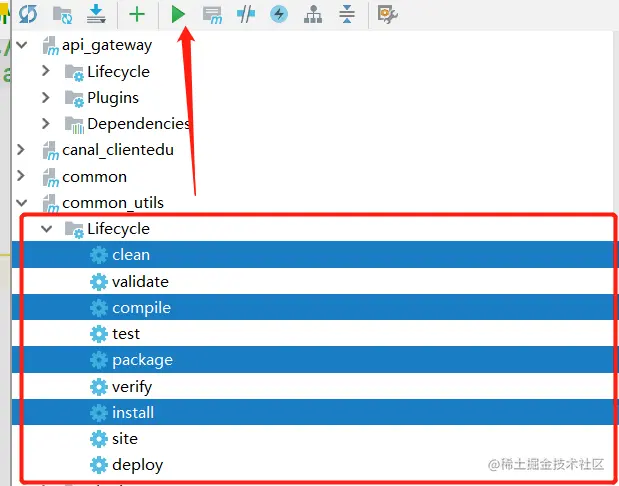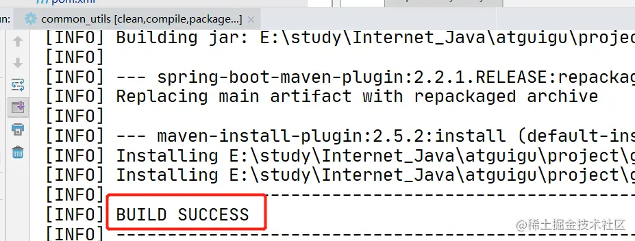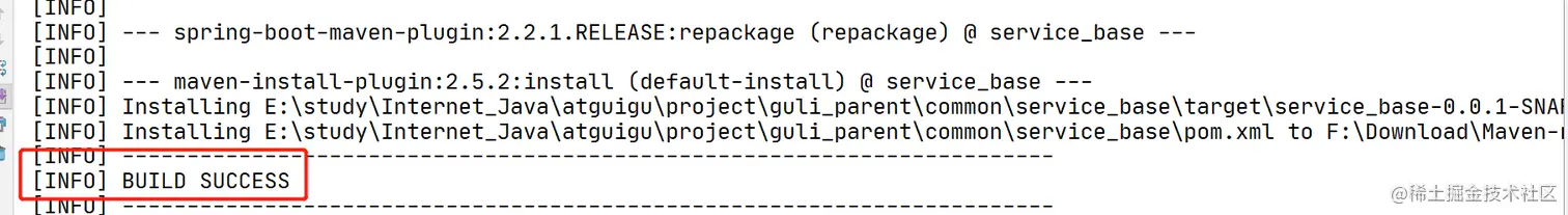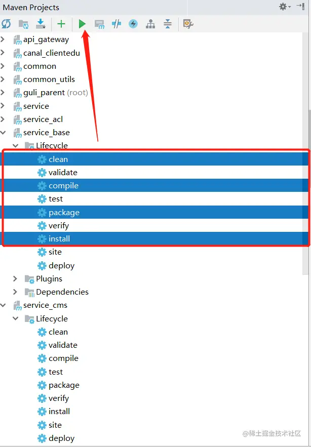 - 接下来将“service_base”微服务模块打为jar包,由于“service_base”和“common_utils”都在同一个父工程“common”,所以“service_base”的pom中没有“common_utils”依赖。maven打包如下图