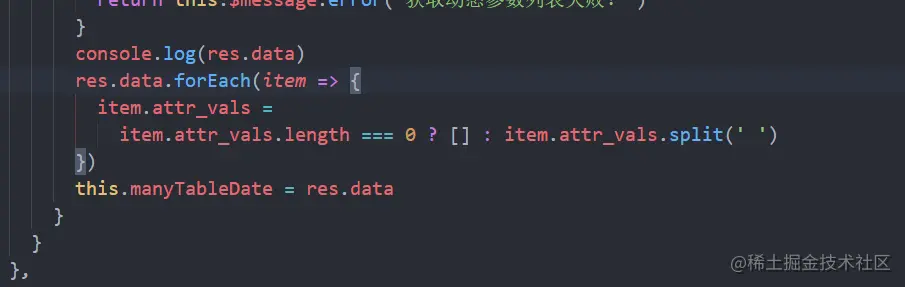 vue-获取回来数据是字符串处理成数组 老实扒蕉的小吴 2020-09-14 239 阅读1分钟 将该数据循环,将其分割成每个item,后再存储到原本的数组中去,就可以将原本字符串类型转换成数组每项 forEach() 方法用于调用数组的每个元素,并将元素传递给回调函数。 注意: forEach() 对于空数组是不会执行回调函数的。 split() 方法用于把一个字符串分割成字符串数组。