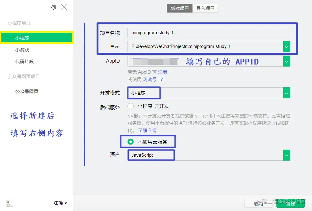 - 后端服务:不使用云服务,前面还是以学习小程序本身为主,不使用此选项