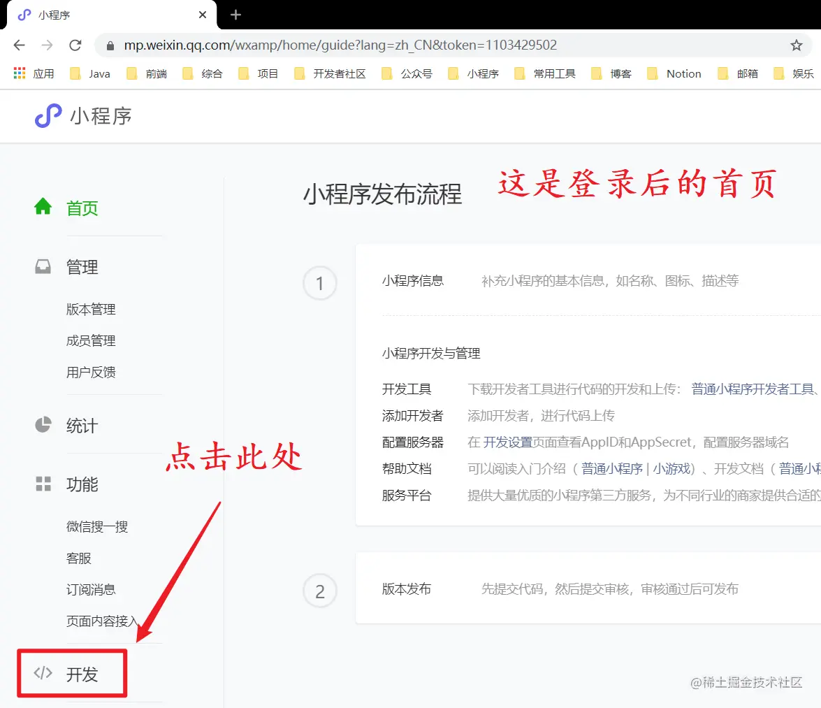 登录后,在开发入门的阶段有一个比较重要的内容需要了解,那就是 APPID,很好理解,就是这个小程序的唯一标识,就类似我们的身份证,登录后首页左侧栏选择【开发】,跳转后,选择【开发设置】就可以看到我们的 APPID