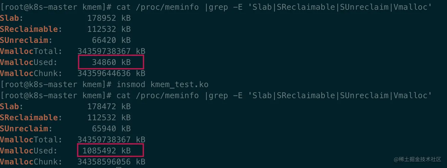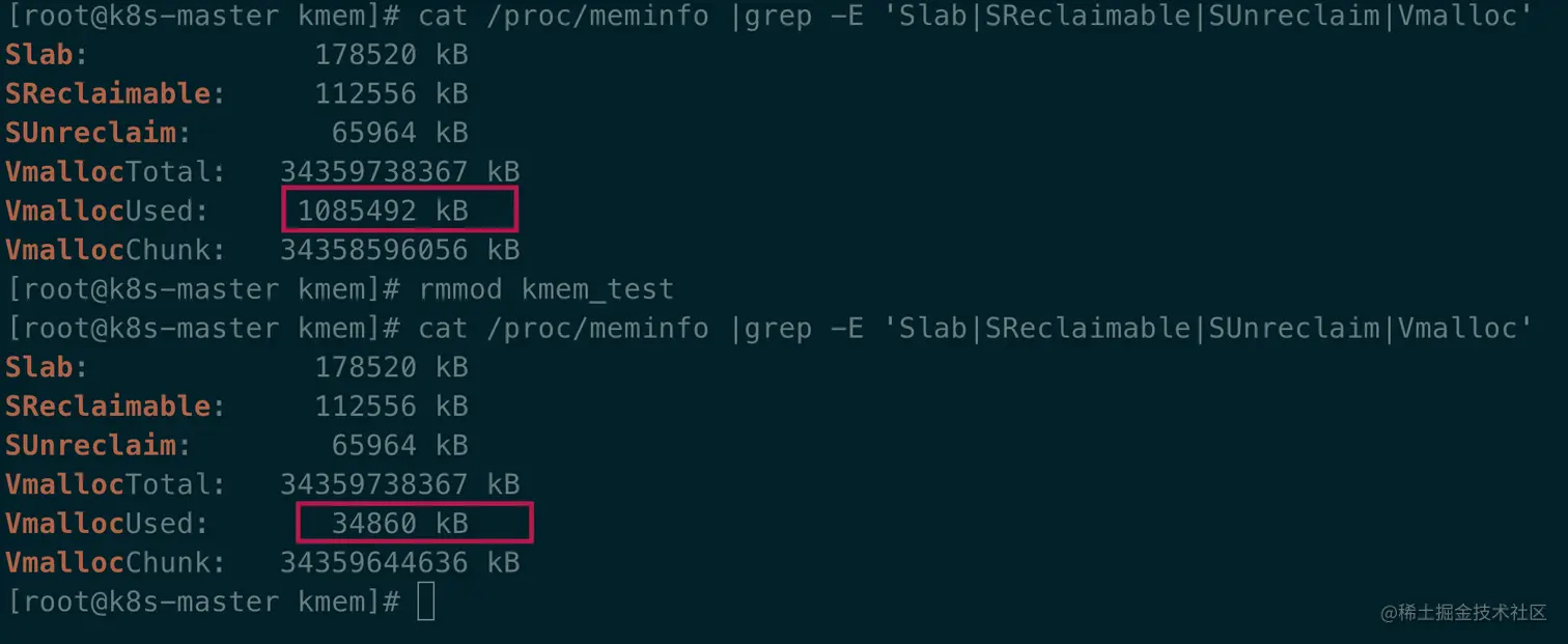 上面输出中,Slab为kmalloc申请的内存信息,其中包括SReclaimable可回收的部分和SUnreclaim不可回收的部分。VmallocUsed为vmalloc申请的内存信息。