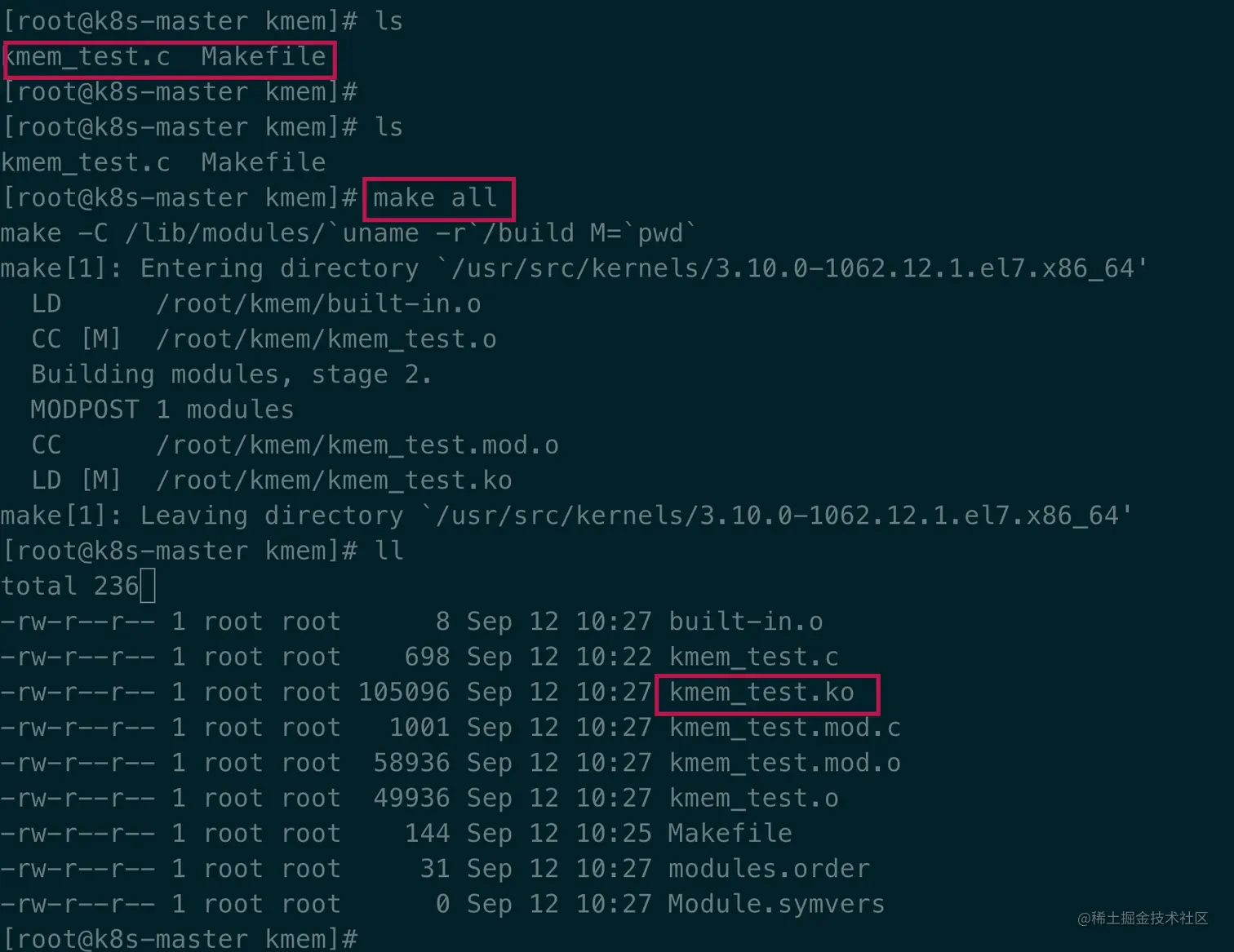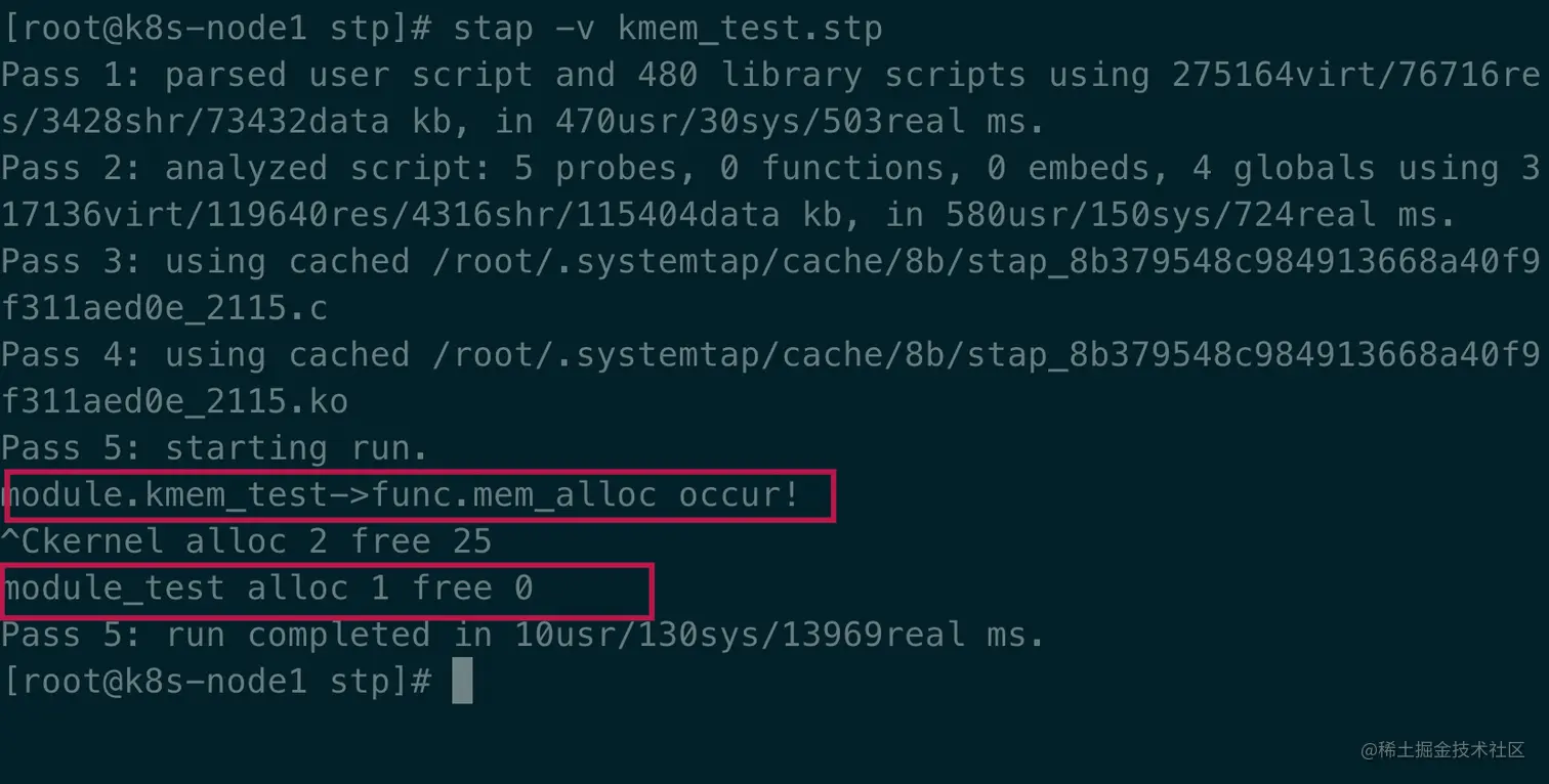 可以看到运行stp脚本后能够追踪到内存分配。但是卸载模块没看到free,不知道是哪里的问题?