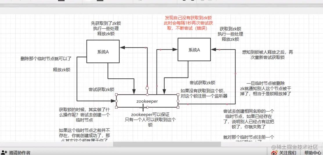 另外一个系统去尝试创建同名的临时节点,如果没有创建成功 那么就注册一个监听器,当释放掉节点以后,zookeeper就会通知系统,然后系统再次尝试去获取锁,也就是尝试去创建临时节点