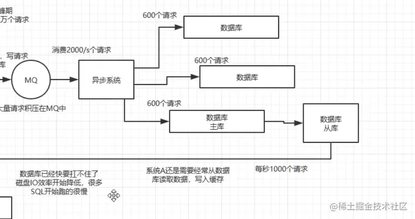 **3.(MQ)**如果用户继续增加,一亿的用户,10000/s个请求; 写请求很高,可以在系统和数据库之间加MQ;虽然每秒来2000个写请求,但是大量请求积压在MQ里面,数据库每秒消费1000个请求,MQ用来削峰