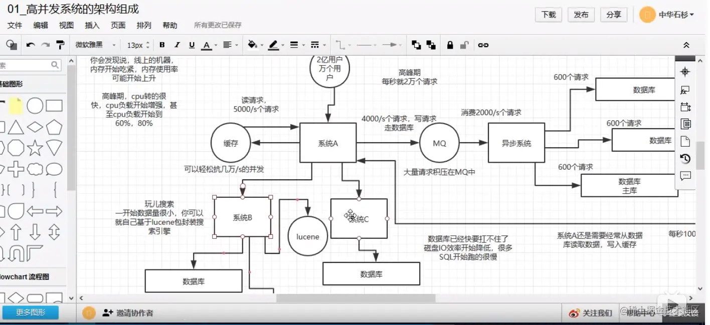总结:实际的真正复杂的系统,高并发远远比这个图复杂很多倍,哪些服务需要分库分表,哪些数据需要放缓存里去,哪些数据可以抗高并发的请求,完成对业务分析之后 逐步加入高并发的系统架构的构造,这个系统是很复杂。