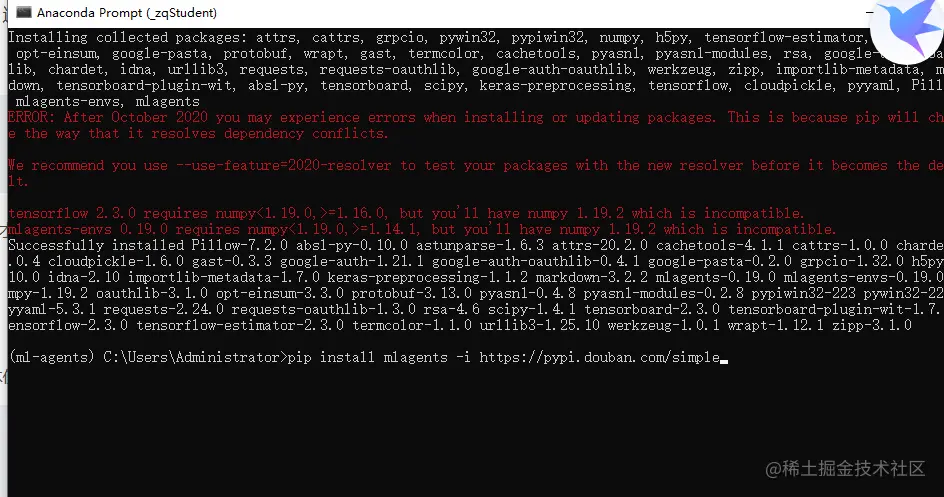 错误:2020年10月以后,您在安装或更新软件包时可能会遇到错误。这是因为pip将改变它解决依赖冲突的方式。 我们建议您使用——use-feature=2020-resolver在新的解析器成为默认值之前用它来测试包。 tensorflow 2.3.0要求numpy<1.19.0,>=1.16.0,但是你会得到numpy 1.19.2,这是不兼容的。 mlagents-envs 0.19.0要求numpy<1.19.0,>=1.14.1,但是您会得到不兼容的numpy 1.19.2。