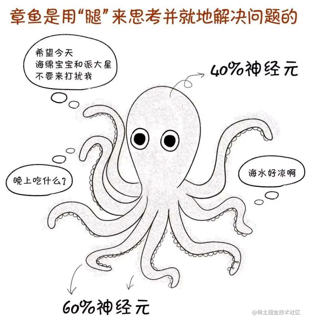 逃跑、捕猎时异常迅速,八条腿明明白白,从不缠绕打结,这得益于章鱼类似分布式计算的“多个小脑+一个大脑”。