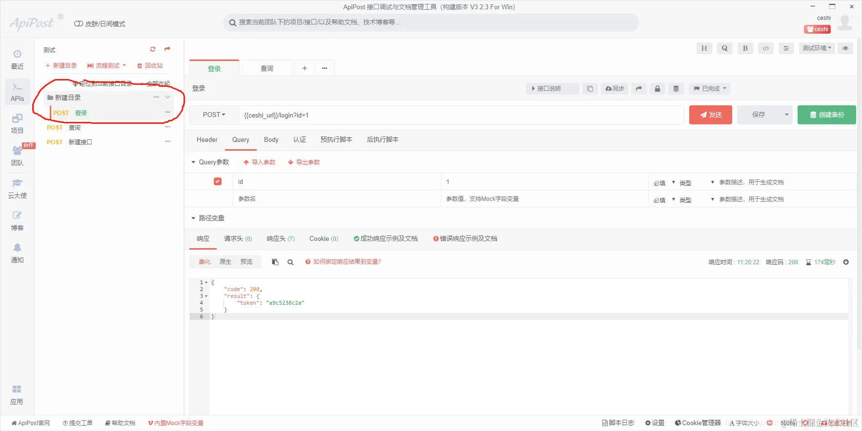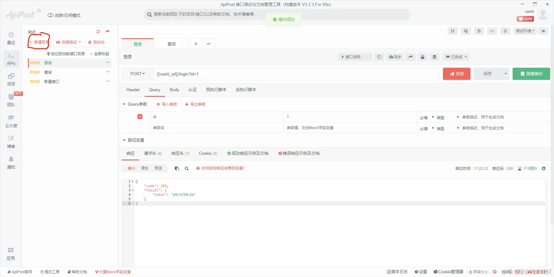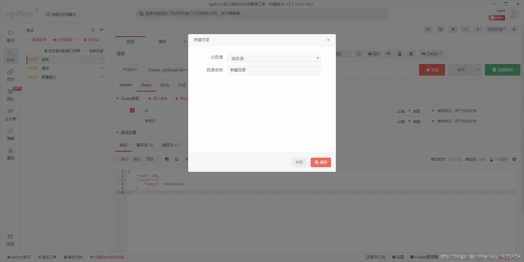 【教程】ApiPost3.0怎样文档移动和文档管理 清清青青 2020-09-14 157 阅读1分钟 apipost3.0版本的接口文档管理和接口文档移动教程 新建一个目录 创建完成命名之后,我们把要想要转移进去的接口文件转移进去,在这里apipost需要按住接口文件中的三个横线的图标才可以拖动,鼠标移动到接口文档上才会显示着三个横线 然后光这样还是移动不到对应的目录中,我们需要点击目录右侧的>图标 点击之后目录会展开 然后我们选择接口文件按住三横线图标进行拖拽就可以实现接口文档移动功能