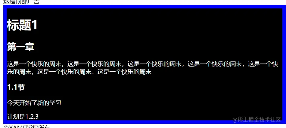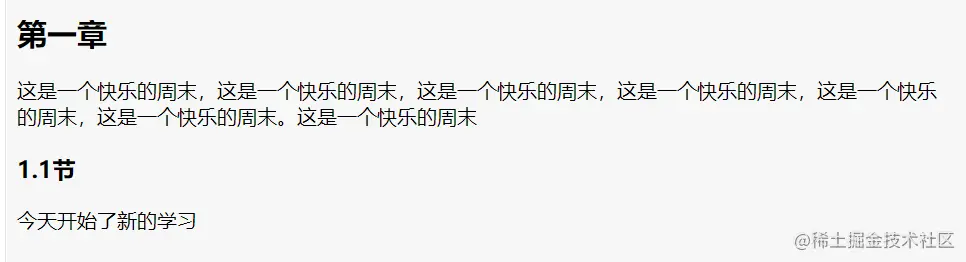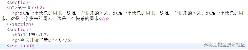section表示开始一个新的大章节(可以在section中套section),p标签表示一段话: 效果如: