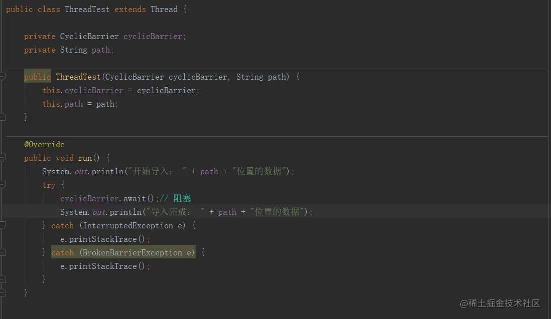 CyclicBarrier 的字面意思是可循环使用(Cyclic)的屏障(Barrier)。它要做的事情是,让一组线程到达一个屏障(也可以叫同步点)时被阻塞,直到最后一个线程到达屏障时,屏障才会开门,所有被屏障拦截的线程才会继续工作。CyclicBarrier默认的构造方法是CyclicBarrier(int parties),其参数表示屏障拦截的线程数量,每个线程调用 await 方法告诉 CyclicBarrier 当前线程已经到达了屏障,然后当前线程被阻塞。
