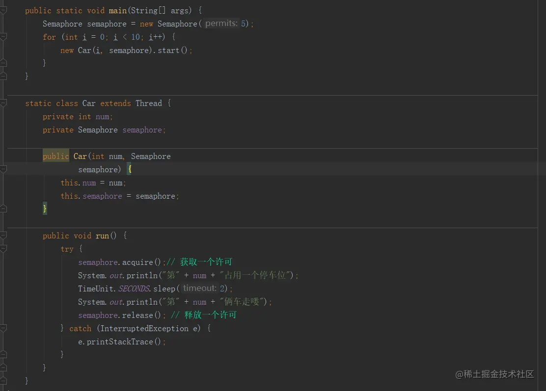 semaphore也就是我们常说的信号灯,semaphore可以控制同时访问的线程个数,通过 acquire 获取一个许可,如果没有就等待,通过release释放一个许可。有点类似限流的作用。叫信号灯的原因也和他的用处有关,比如某商场就5个停车位,每个停车位只能停一辆车,如果这个时候来了10辆车,必须要等前面有空的车位才能进入。