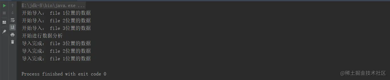 我们创建了 CyclicBarrier 对象并且设置了阻塞的线程数和子线程,当我们的三个测试线程都被阻塞后,执行子线程,并且被阻塞的线程数达到了最大阻塞个数,全部放行。