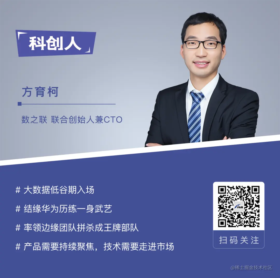 但总有目光长远的战略家愿意提前布局潜力技术,比如华为。在大数据行业的冰川期偶遇华为,就是方育柯所说的修仙奇遇之一。 2006年,功能机+WAP还是时髦事物,iPhone尚未横空出世,方育柯所在的电子科技大学数据挖掘团队已与华为展开了“大数据分析手机上网习惯判断用户兴趣”的科研合作:一是基于用户浏览网页信息进行分析,利用自然语言处理解读网页信息并判定用户兴趣,再由电信运营商基于用户兴趣投放商业信息完成闭环;二是基于各大论坛社区的用户关系分析,找到影响力最大的中心型节点用户——那一年,推特刚刚降生,源自微博的“大V”称呼尚未出现——便于广告商筛选高质量投放渠道。 如今听来这些技术原理并不复杂,但在WAP时代便有此远见,不得不让人慨叹一句华为就是华为。而对方育柯来说,参与超前于时代的前瞻性项目,自然也收获了超出同辈多个身位的成长。 如今听来这些技术原理并不复杂,但在WAP时代便有此远见,不得不让人慨叹一句华为就是华为。而对方育柯来说,参与超前于时代的前瞻性项目,自然也收获了超出同辈多个身位的成长。 2011年,在华为产品线总裁的盛情邀请下,方育柯成为了华为技术团队的一员。 从解散到壮大 从15人到上千人 仅仅入职一个月之后,方育柯所在的部门宣告解散。 华为内部施行着极度严格的考核政策,没有完成既定指标便自动触发优化措施,比如解散被认定难以为继的团队。这可苦了刚刚加入的方育柯,不得不应对这一计划外的变动,被迫再次进行关乎人生方向的重大选择:西安、印度,或是产品线其他团队。权衡再三,他选择加入大数据产品部,担任大数据架构师。 2011年,草创期的华为大数据产品部只有10+人,团队状况堪称内外交困:外部,从上峰的种种行为推测,“没有人认为这个团队能干出什么事情”;内部,缺乏明确战略方向,探索业务遭遇信任障碍迟迟打不开局面,试着联合兄弟部门做安全数据分析、APP下载推荐,也屡屡吃到闭门羹。 绝境中,方育柯们没有放弃自己。 业务侧,他们以强大的韧性,顶着超高的拒绝率坚持出击,参与多个项目的POC比拼测试,不断敲开陌生客户的大门并依据市场反馈迭代服务,最终在众人惊诧的目光中,拿下了某著名商业银行的“用户属性特征分析”项目,并因此摘得“金牌团队”的荣耀,方育柯本人也斩获“关键技术突破奖”。 技术侧,团队成员在Hadoop社区已经有较多代码贡献,团队决定试水Hadoop发行商,这意味着团队需要在Hadoop 2.0 alpha版本基础上进行完善修复,以达到商用级标准。这是一条技术难度高、市场竞争激烈的道路,仅华为内部便有三个团队同步推进相关业务,一年后,团队在建行、联通等知名企业的POC测试中表现优异,成为华为狼性赛马机制的胜出者。 短短几年时间,大数据产品部便从最初的10余人成长至千人规模,这支曾经的边缘流兵团摇身一变,成为华为产品线的王牌正规军。 出人意料的是,作为这场惊天逆袭的主导者,方育柯却在2014年选择了离开,原因:以百年基业为发展目标的华为,在各种规范和条条框框的约束上比较严格,这对于以大数据分析安身立命的方育柯造成了一定的束缚感。相比之下,“数之联是一个具有浓厚大数据基因的初创企业(三位创始人都是大数据领域的专家),加上多年师生情谊的信任基础,作为联合创始人,他相信未来一定能在大数据分析服务的蓝海中大显身手,奋斗出一片广阔的新天地”。 2014年,方育柯离开华为,加盟数之联。