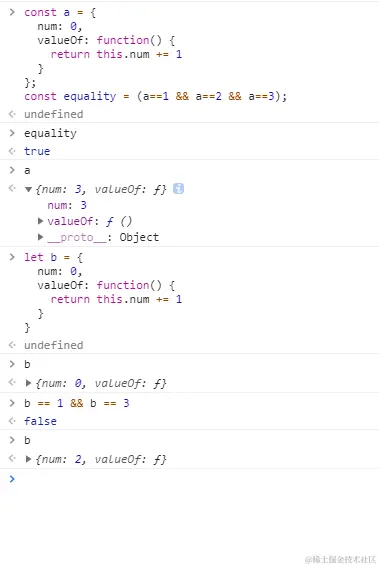 a == 1 && a == 2 && a == 3 为 true 肖兴 2020-09-14 219 阅读1分钟 什么情况下 a == 1 && a == 2 && a == 3 为 true ? 当你两种不同类型的遇到相等操作符的时候,js会对其进行类型转化——它企图将操作数的类型转化为类似的 当对象转换原始值时会调用内部的valueOf,此时改写valueOf即可实现 ``` ```