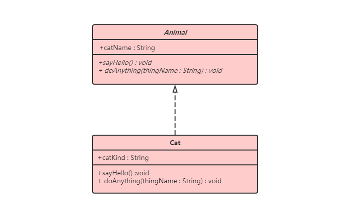 关于抽象类的表示方法,抽象类的方法名以及其中的抽象方法采用斜体表示,且实现方式也是虚线状的空心箭头。