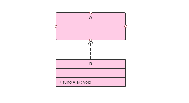 依赖主要表现为一个类中使用到了另一个类,而这个使用是非必须的,在下面的类中,类B在方法中使用到了类A,从而就形成了B依赖A的关系。