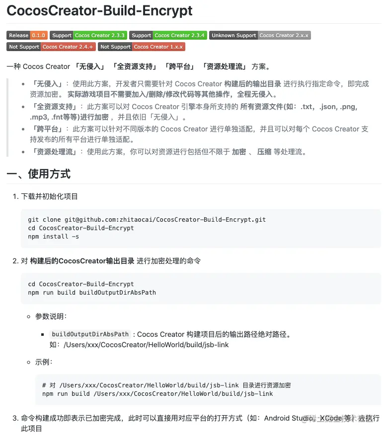 而我们的例子 [CocosCreator-Build-Encrypt]支持的还比较少,但是作为一种方案,它理论上能支持我上面所说的特性: