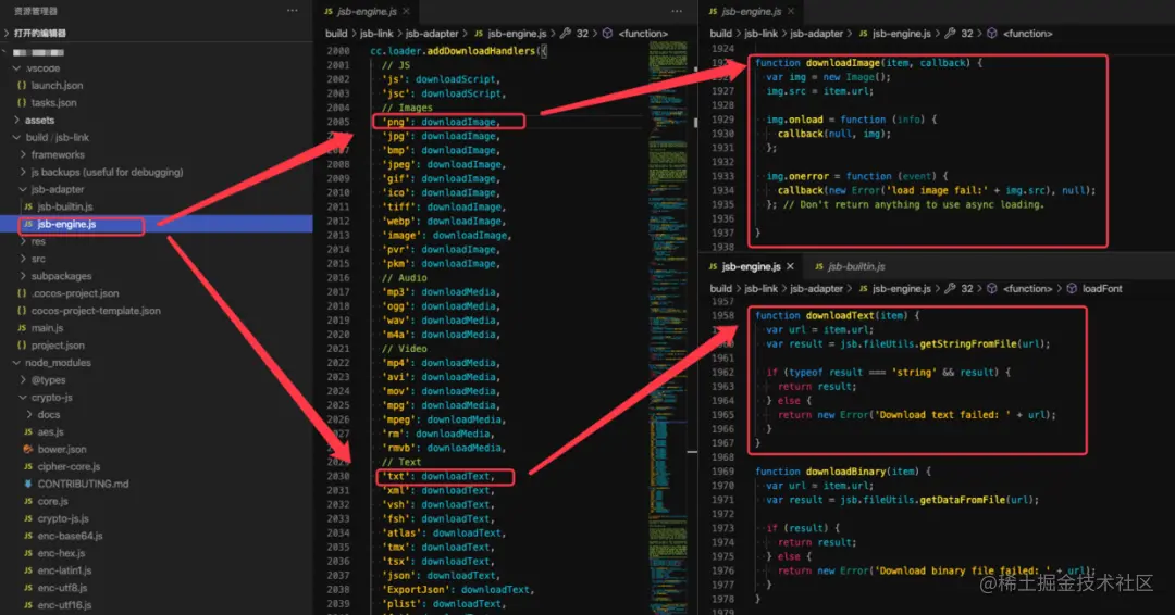 A:在 Cocos Creator 2.3.3 打包原生平台后,会生成一个 jsb-adapter 文件夹,在 jsb-adapter/jsb-engine.js 中,可以看到在原生平台上,引擎是重写了资源加载的方式以适配原生平台,参考这里面 png 和 txt 的加载方式,就可以写出第2步中的代码了—— 在原生平台上读取文件,并转换为内存对象。