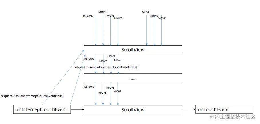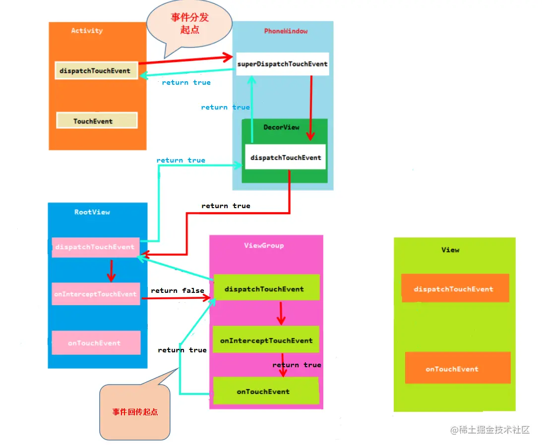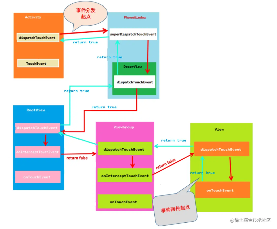 - 事件返回时, 子View的 dispatchTouchEvent 给了父View 的 dispatchTouchEvent 一个 false 返回值,父View 调用自身的 onTouchEvent,反之,如果返回了 true, 父View 则调用子View 的dispatchTouchEvent。