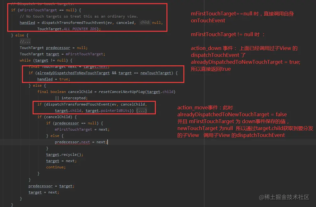 - mFirstTouchTarget 是一个viewGroup 是否有孩子处理该事件的一个标志,为null 标明没有孩子处理它,否则标明 action_down 已经分发给它的孩子了