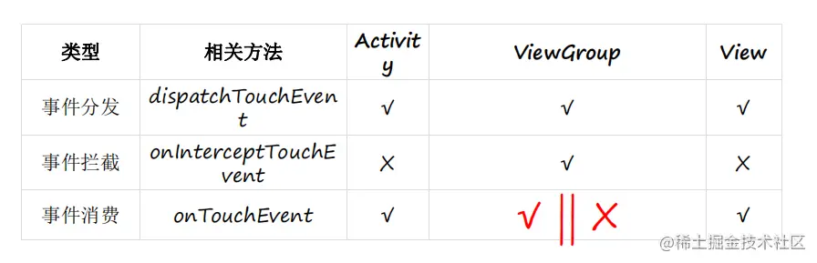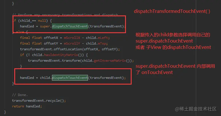 - ViewGroup 是根据 onInterceptTouchEvent 的返回值来确定到底是调用子 View 的dispatchTouchEvent 还是自身的 onTouchEvent 的( 调用自身ontouchEvent 是通过 super.dispatchTouchEvent 来完成的)