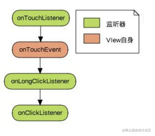 - 长按事件( onLongClickListener) : 同理,也是需要长时间等待才能出结果,但因为不需要 ACTION_UP,所以应该排在 onClickListener 前面。( onLongClickListener > onClickListener)