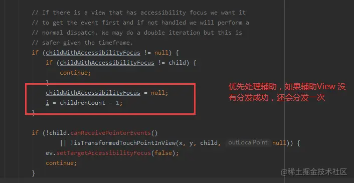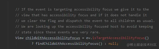 如果这个事件带有FLAG_TARGET_ACCESSIBILITY_FOCUS 标志,说明它是来自辅助功能的,那么我们优先分发给辅助功能View,如果它不处理,那么我们就会清除这个标志,照常分发给其他所有孩子。