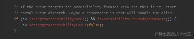 分发完成后,没有人愿意接收这个辅助功能事件,所以我们直接清除 FLAG_TARGET_ACCESSIBILITY_FOCUS 标志。