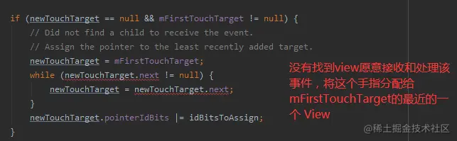 没有找到view愿意接收和处理事件,将这个手指分配给 mFirstTouchTarget最近的View
