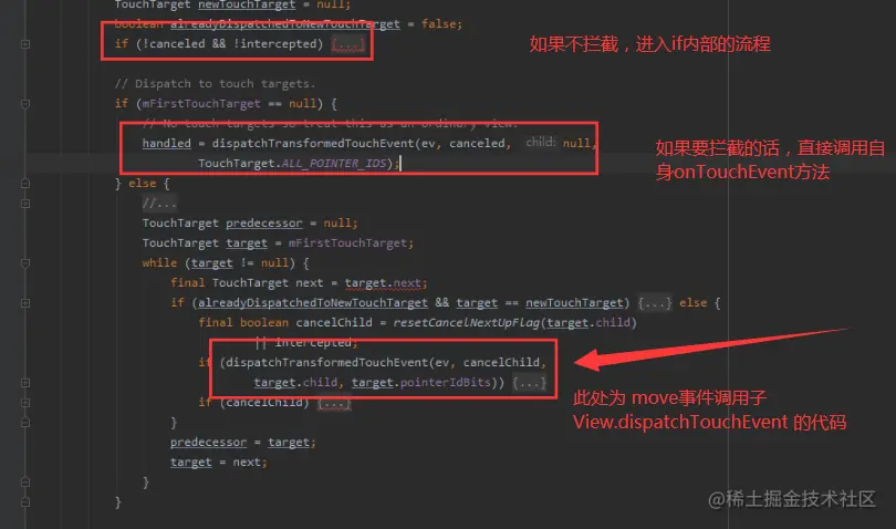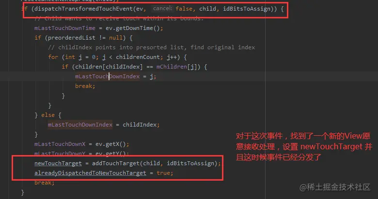 对于这次事件,找到了新子View 接收处理, 设置 newTouchTarget ,同时设置 alreadyDispatchedToNewTouchTarget 为true, 后面就不需要再进行分发了。
