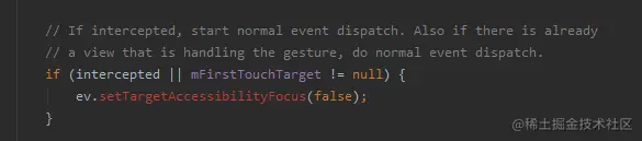 - 如果这个事件被该ViewGroup拦截,或者已经有子View 正在处理这个手势,我们清除这个事件的FLAG_TARGET_ACCESSIBILITY_FOCUS标志,进行正常的分发。