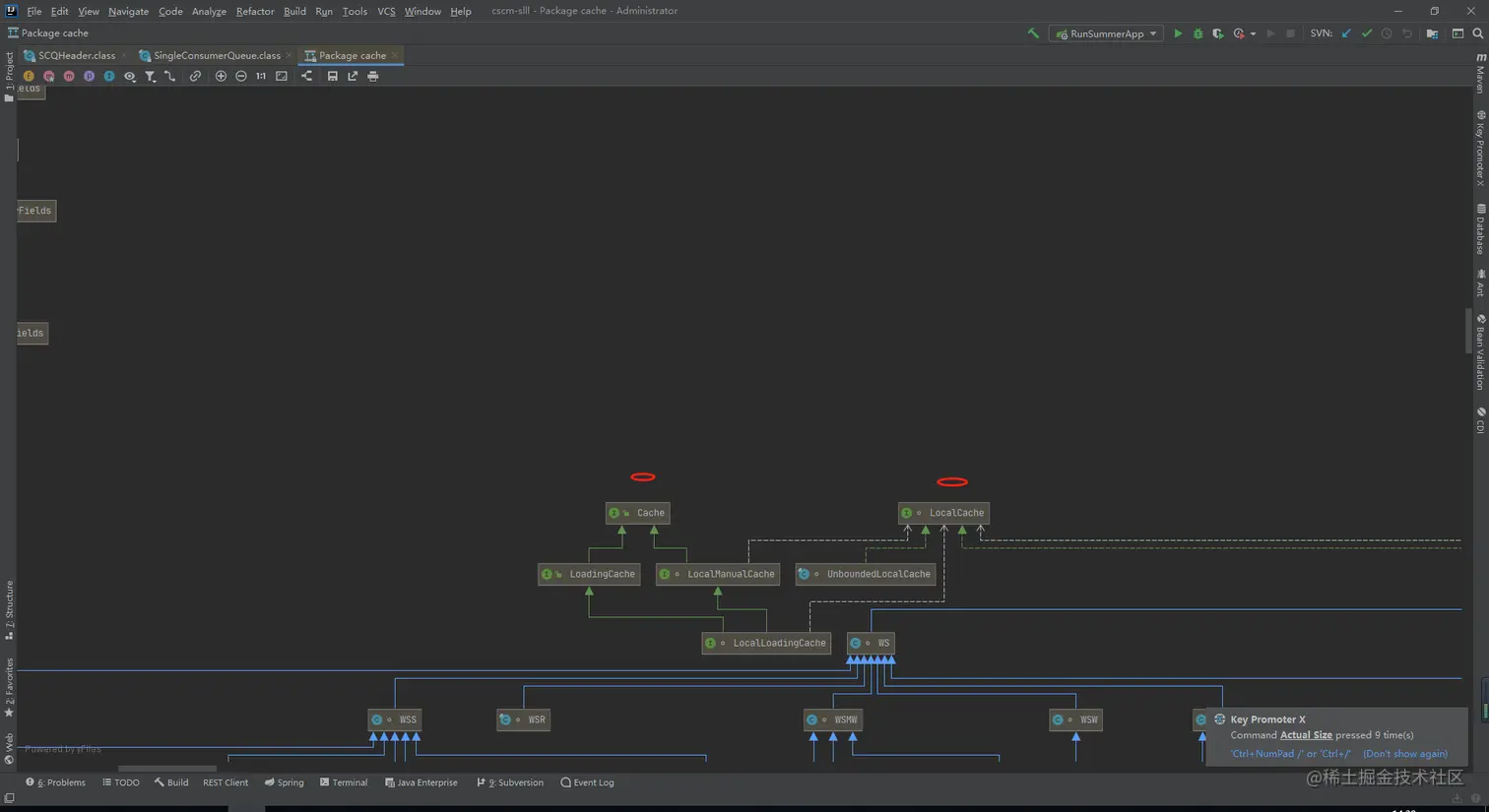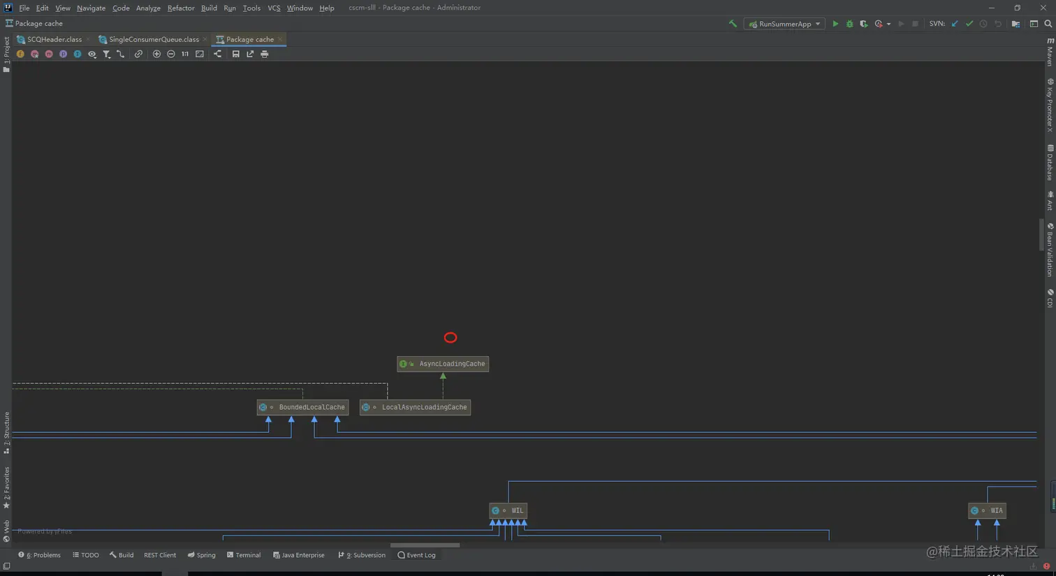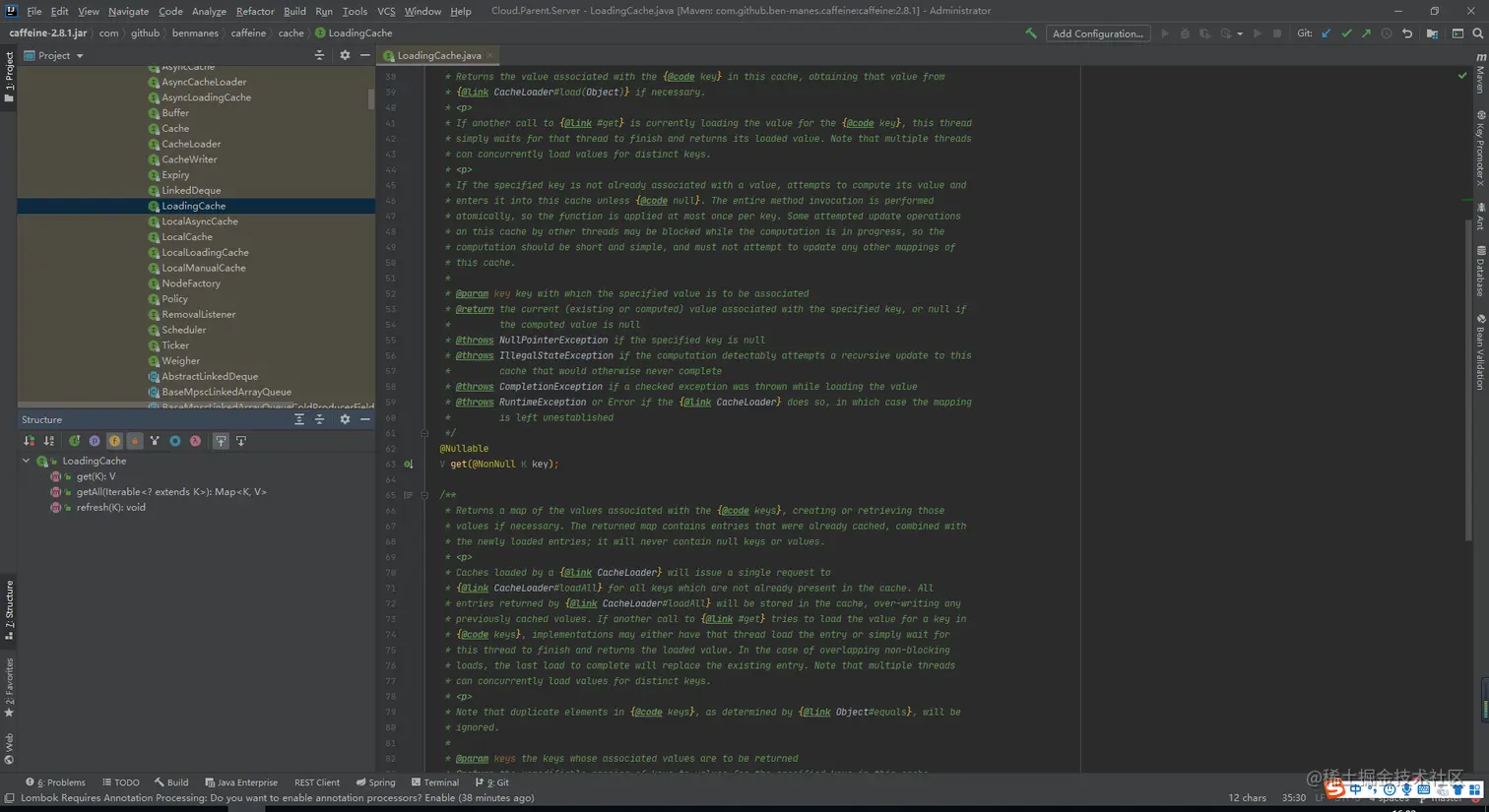 对于蓝色实线类名全大写的类可以忽略,它其实是动态生成的类.着重关注的是Cache、LocalCache、AsyncLoadingCache这三个顶级接口的具体实现