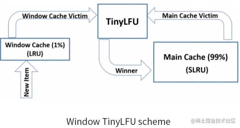 W-TinyLFU由窗口缓存和主缓存两部分组成,同时也是Caffeine采用的缓存策略