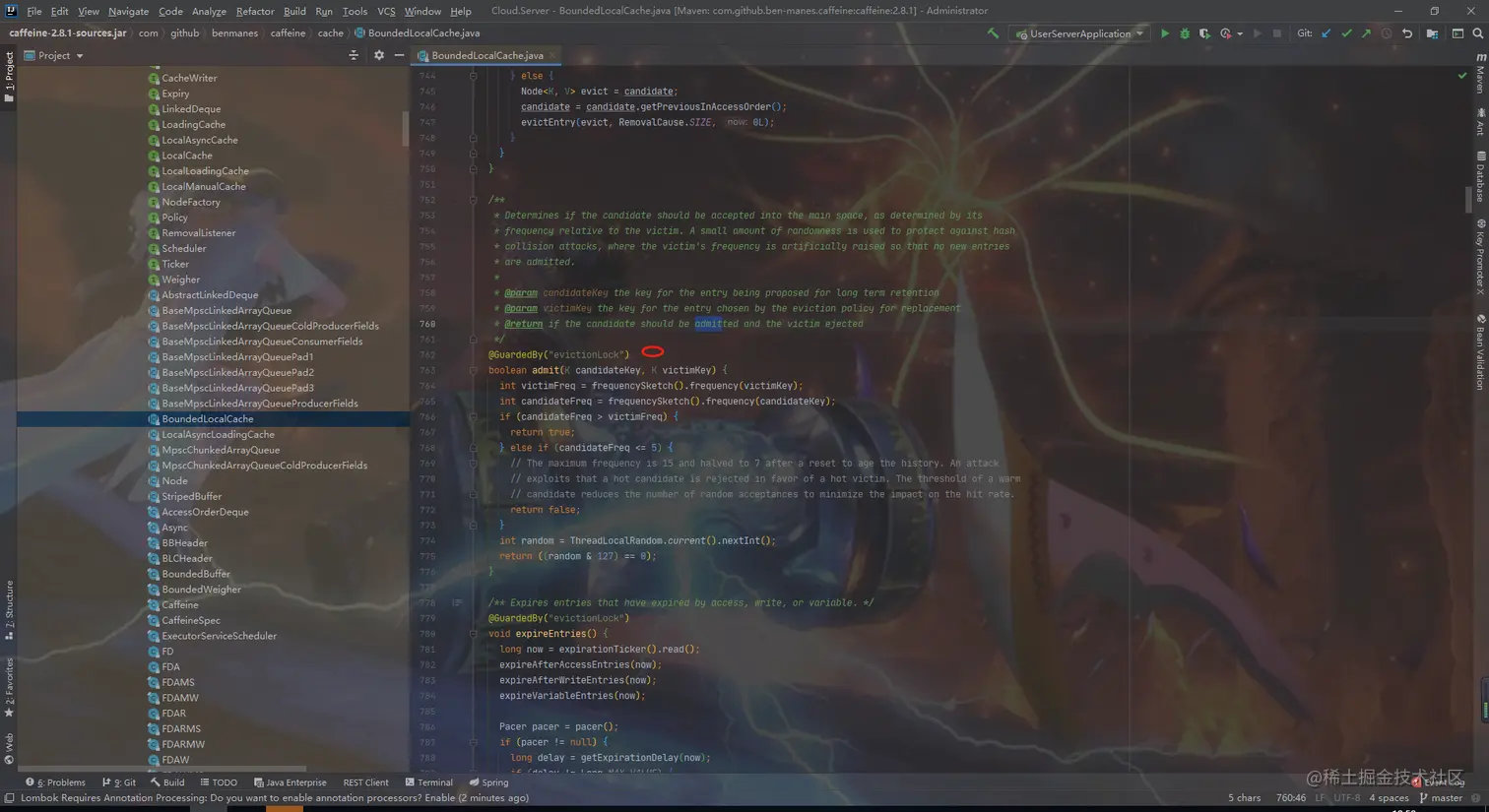 具体可以通过查看Caffeine框架中BoundedLocalCache类的admit方法,如图