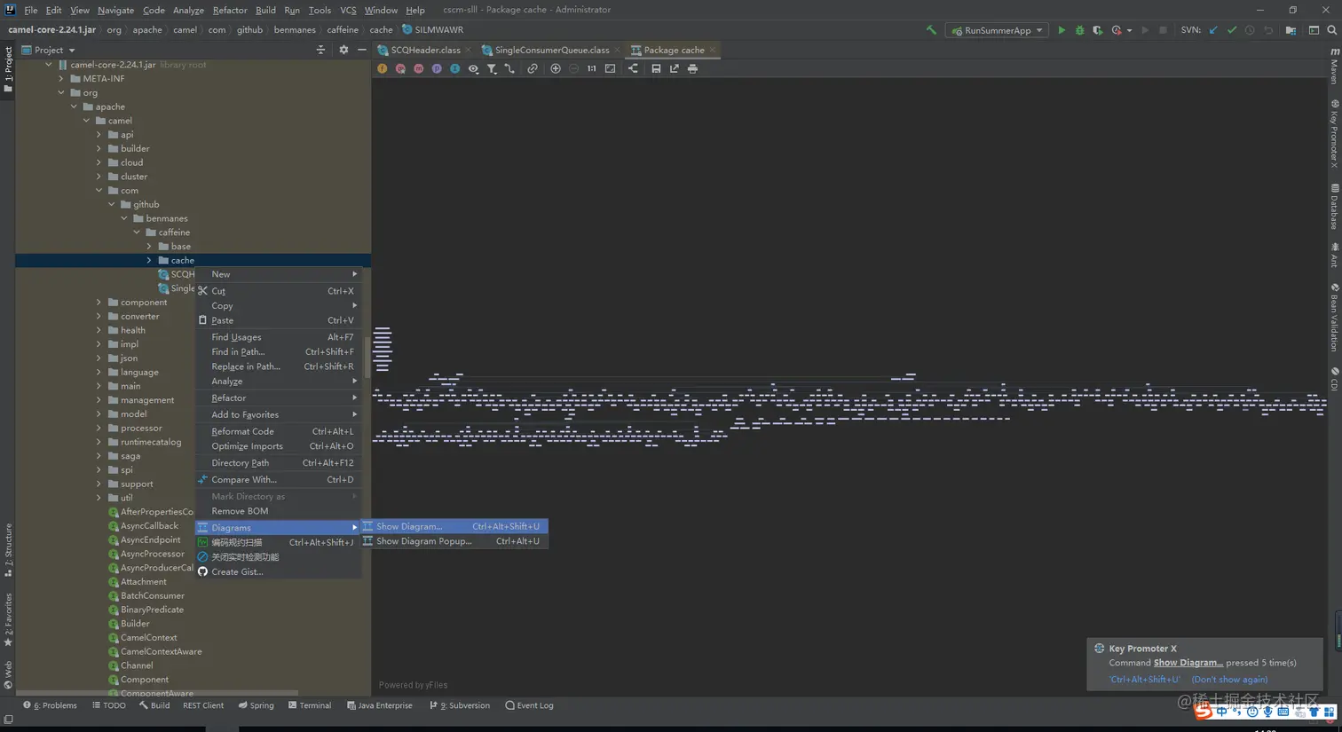 可以发现Caffeine源码中有两个包和两个类,具体实现逻辑都在cache包下面,通过idea打开这个包的UML类图