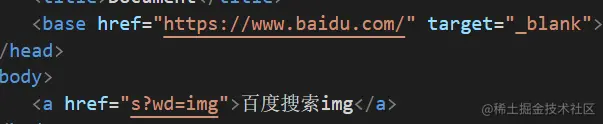 a、img等含有的url拼接上base中的url。图中的超链接点击后会跳转到https://www.baidu.com/s?wd=img,可以用target属性控制控制打开位置。<meta>指定编码或者视口。<link>请求href中的url(CSS、JSONP),无刷新。<script>请求脚本文件或者在标签中写脚本。<title>网页标题。<style>标签中写CSS样式,无刷新。