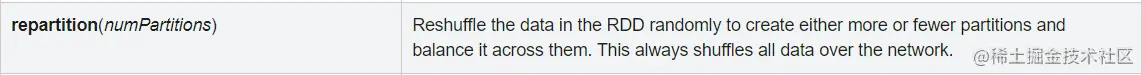随机地重新排列RDD中的数据以创建更多或更少的分区,并在整个分区之间保持平衡。这一定会在网络上产生大量Shuffle。
