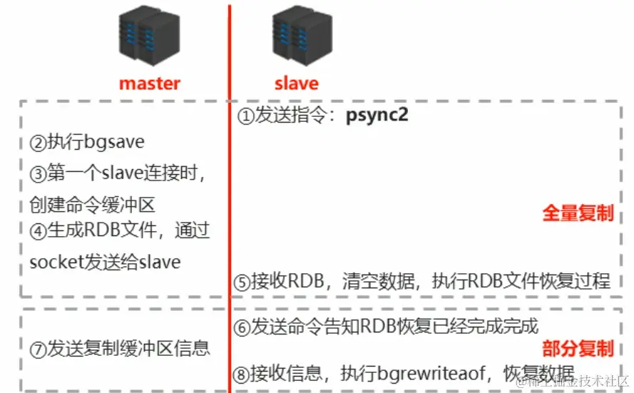 数据同步又分为全量复制和部分复制两块,其中全量复制就是你启动同步指令之后进行的RDB操作,把master中的数据通过RDB发送给slave。由于RDB采用bgsave指令,所以在全量复制期间master所做的操作会进入一个缓冲区,当全量复制结束后就需要通过部分复制来恢复缓冲区中的操作,这里采用AOF。