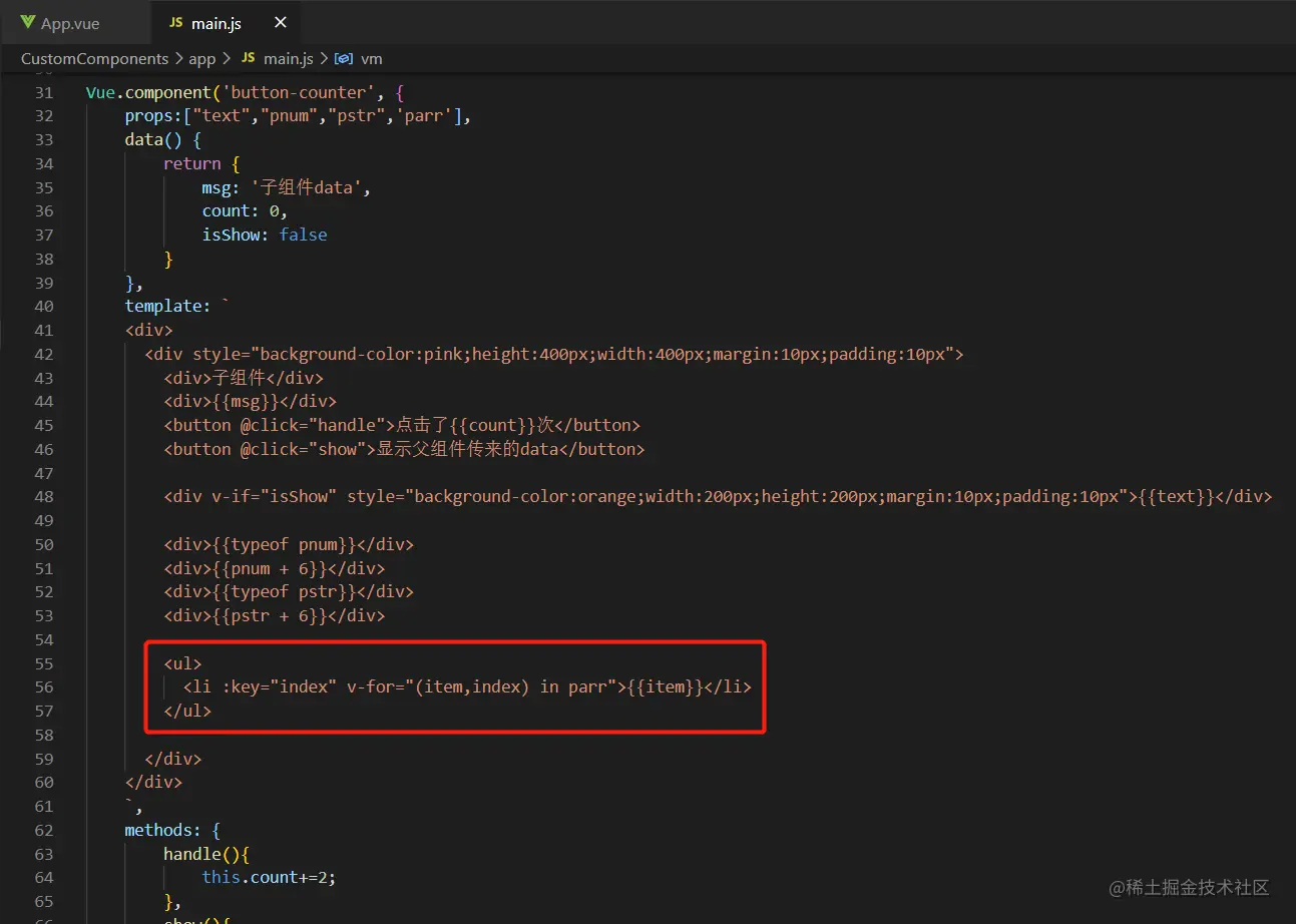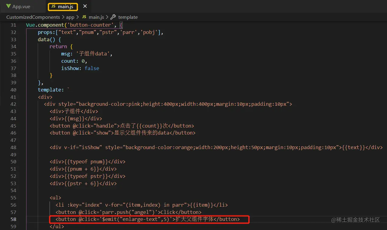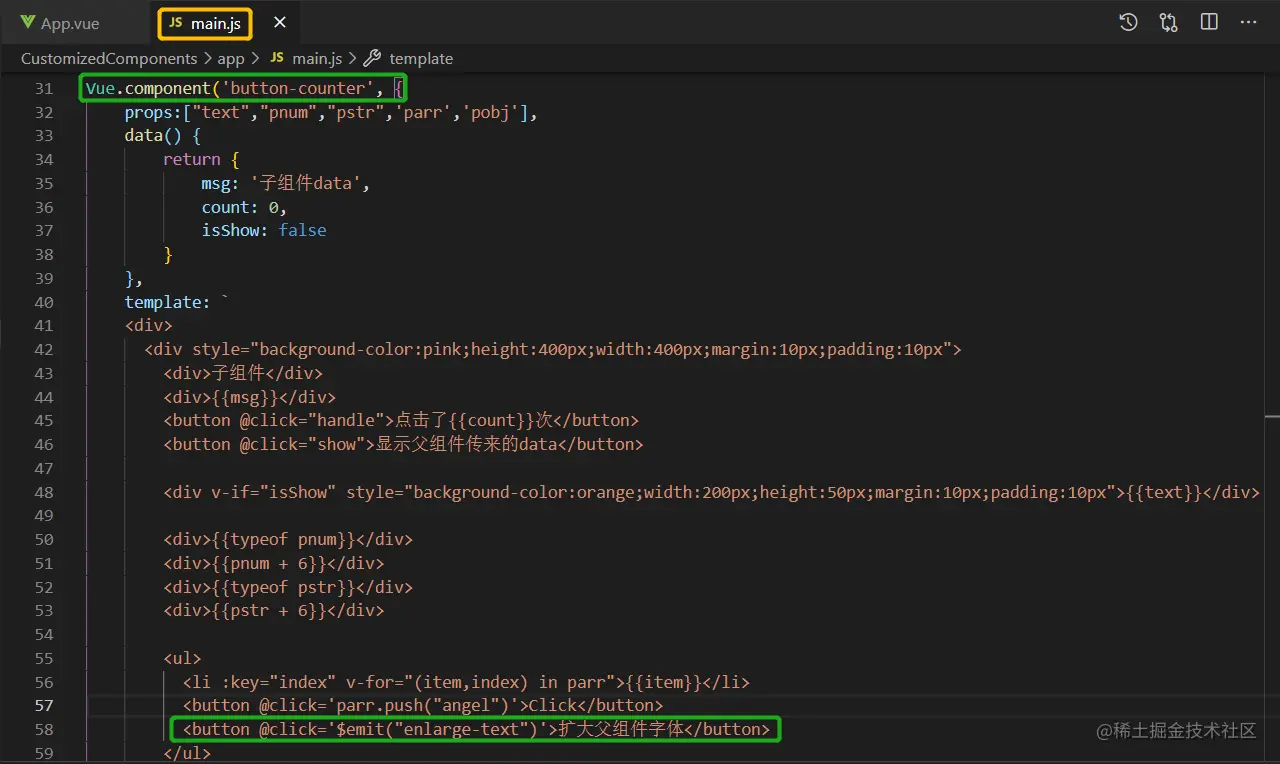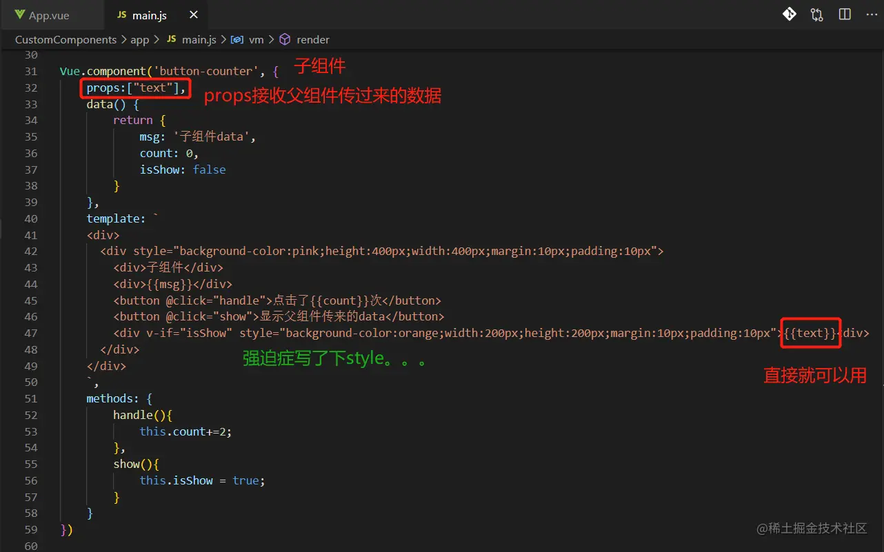 这里就拿button-counter这个子组件来举个栗子,重点分清数据传递的点和线以及父子组件之间的层次关系,有点绕,不懂多看几遍。