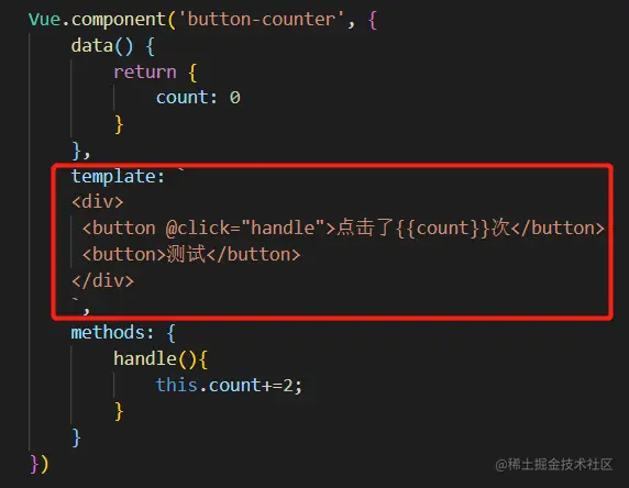 ③组件模板内容可以是模板字符串; 但需要注意的是这是在ES6语法规则的前提下才可以的,需要浏览器的兼容性支持。后续学到前端工程化后这个问题可以忽略。下面举个栗子看看通过模板字符串如何处理模板内容。 我们之所以需要用到模板字符串是在这样一个情境下的,我们定义组件时是用template属性来定义模板内容的,如果内容量很大就会让代码挤成一长串降低可读性,而利用模板字符串来编辑模板内容则可以让代码更加规整和直观。