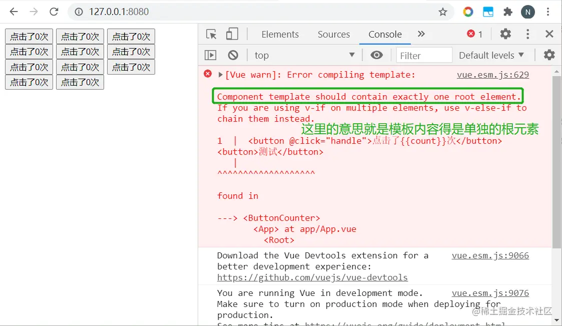 ②组件模板内容必须是单个根元素; 下面图示一下如果模板内容不是单个根元素会出现什么问题。