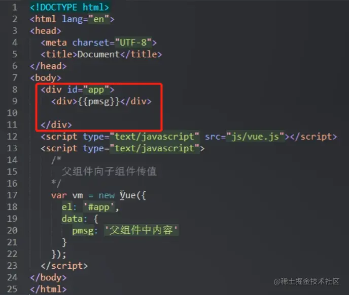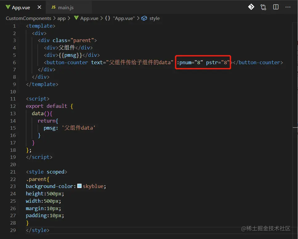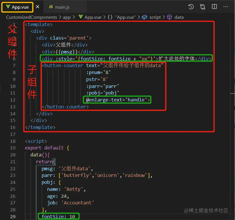 其实父子组件之间不像是上面图示这样的里外包含关系而是上下树状关系,但在这个点的讲解上我认为这样标识或许更好理解,上面我直接将要传递的数据写在自定义属性里了,这个数据应该写在父组件的data里再插值表达式引上去会表达的更清楚些,同时,这个自定义属性可以是像上面这样静态的也可以写成动态,动态自定义属性在上面贴出的笔记中有讲解这里就不说了。