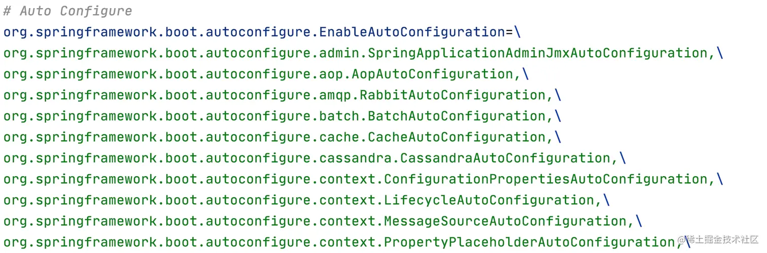 - 从properties中获取到EnableAutoConfiguration.class类的值,把他们添加在容器中