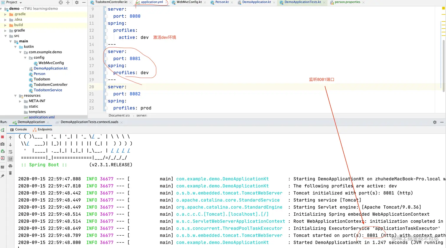 配置文件:spring.profiles.active=dev (在application.properties中指定)
