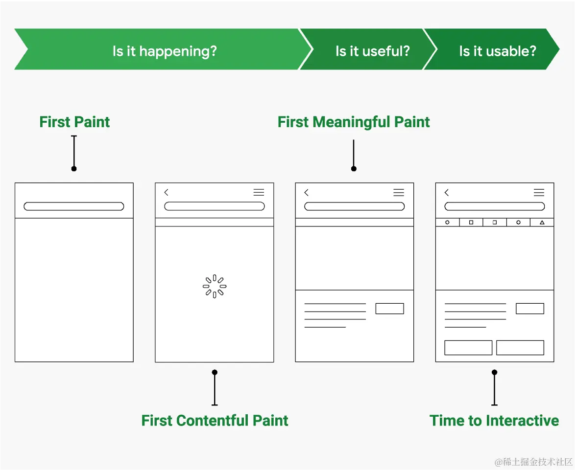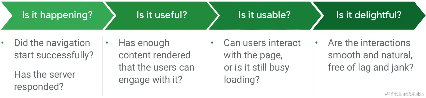 与其只用一个指标来衡量负载,不如对体验过程中影响用户对负载速度感知的每个时刻进行计时。当用户导航到一个网页时,他们通常在寻找某些类型的反馈。