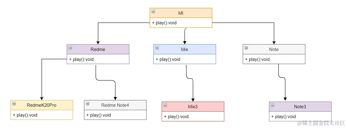 这里选用了小米手机的型号,可以看到无论是使用继承环视聚合的方式,抽象层和实现层之间均不相互独立,当有一者发生改变的时候,与之相关联的就会发生改变。也正是因为这个原因出现了桥接设计模式。