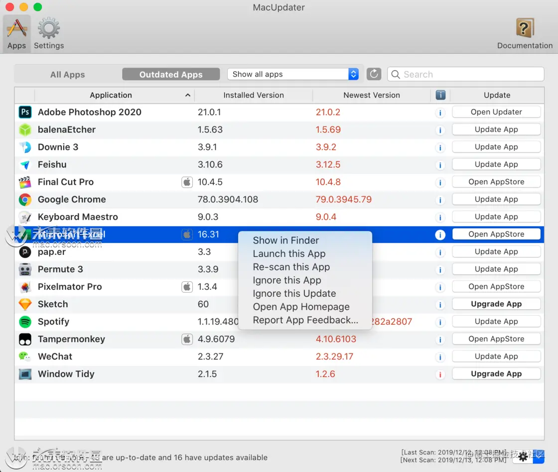 另外,你也可以通过右键,来对 app 的更新进行详细操作。例如忽略此次更新,或是完全忽略这个 app 的所有更新,以及打开 app 所在位置、重新扫描等。