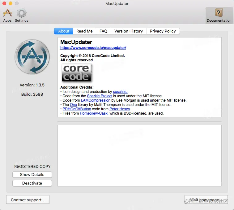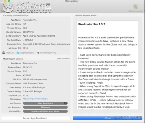 点击升级旁边的「i」,还可以查看详细的更新信息,包括软件的更新说明、开发者、甚至是软件主页和安装来源。如果你发现 MacUpdater 有信息错误或是更新问题,还可以点击「Report App Feedback」给他们发送反馈。