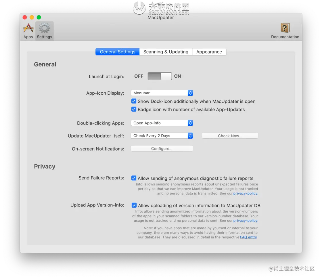 在最下方还有一些相关的信息,比如你的 Mac 里共安装了多少款 app,有多少款是最新版本,有多少是需要更新的,以及上一次扫描和下一次扫描的时间。 需要提醒的是,如果是 MAS 来源的 app,MacUpdater 能够扫描出来,但无法再 app 内升级,需要跳转到 MAS 进行操作。而对于非 MAS 的 app,就可以在 MacUpdater 一键无痛升级。 来到设置界面之后,你会发现,MacUpdater 的自定义程度极高,能够覆盖不同人群的各种使用偏好